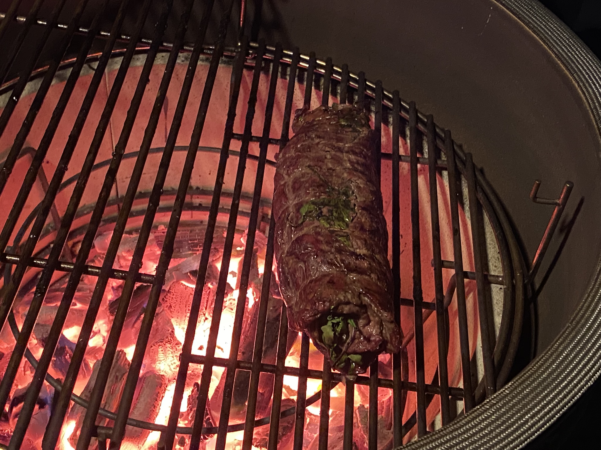 Je kunt deze rollade maken met de reversed sear methode, een techniek waarbij je eerst langzaam en gecontroleerd op indirecte hitte gaart. Dit zorgt ervoor dat de bavette gelijkmatig opwarmt en dat de smaken zich goed ontwikkelen. Pas op het einde geef je het vlees een snelle sear boven directe hitte, waardoor een knapperige, smaakvolle korst ontstaat. Deze aanpak is ideaal als je volledige controle over de garing wilt houden en een mooie, sappige rollade wilt serveren.