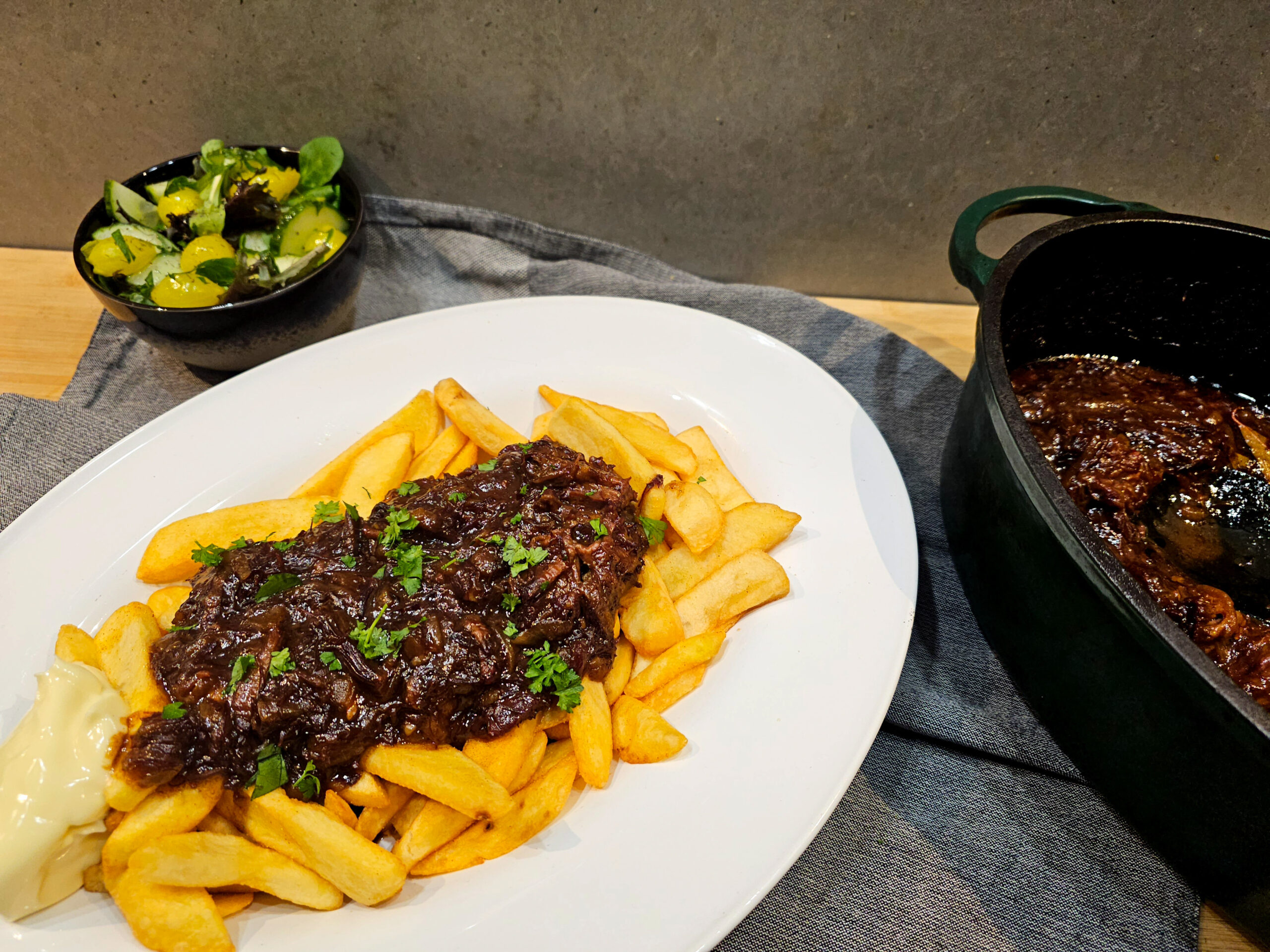 In dit recept geven we een unieke BBQ-draai aan het gerecht door de beef ribfingers eerst te grillen voor extra smaak en ze vervolgens langzaam te stoven in een Dutch oven op de barbecue. Het donkere bier voegt een diepe, volle smaak toe, terwijl de marinade de malse structuur van het vlees garandeert.