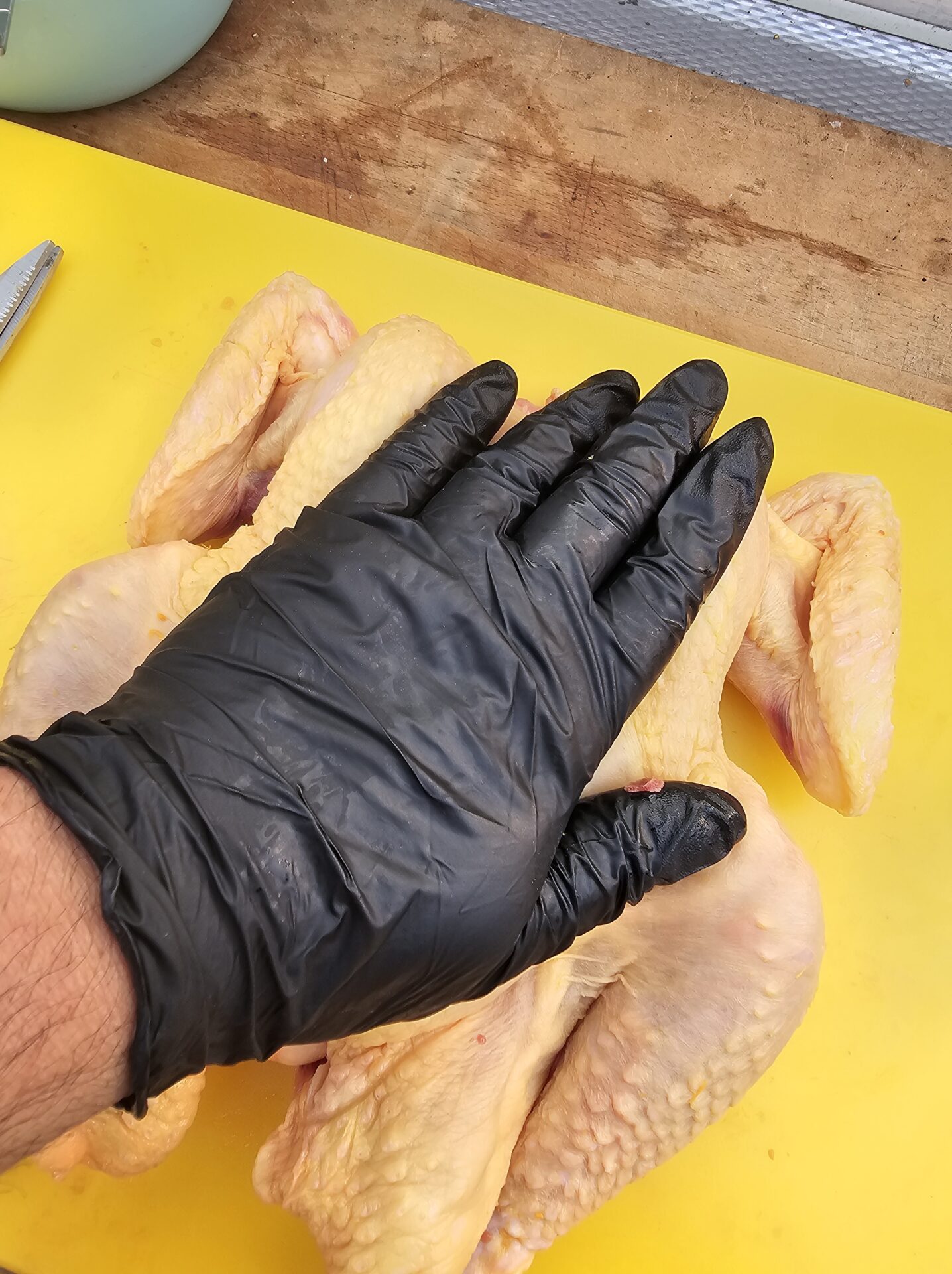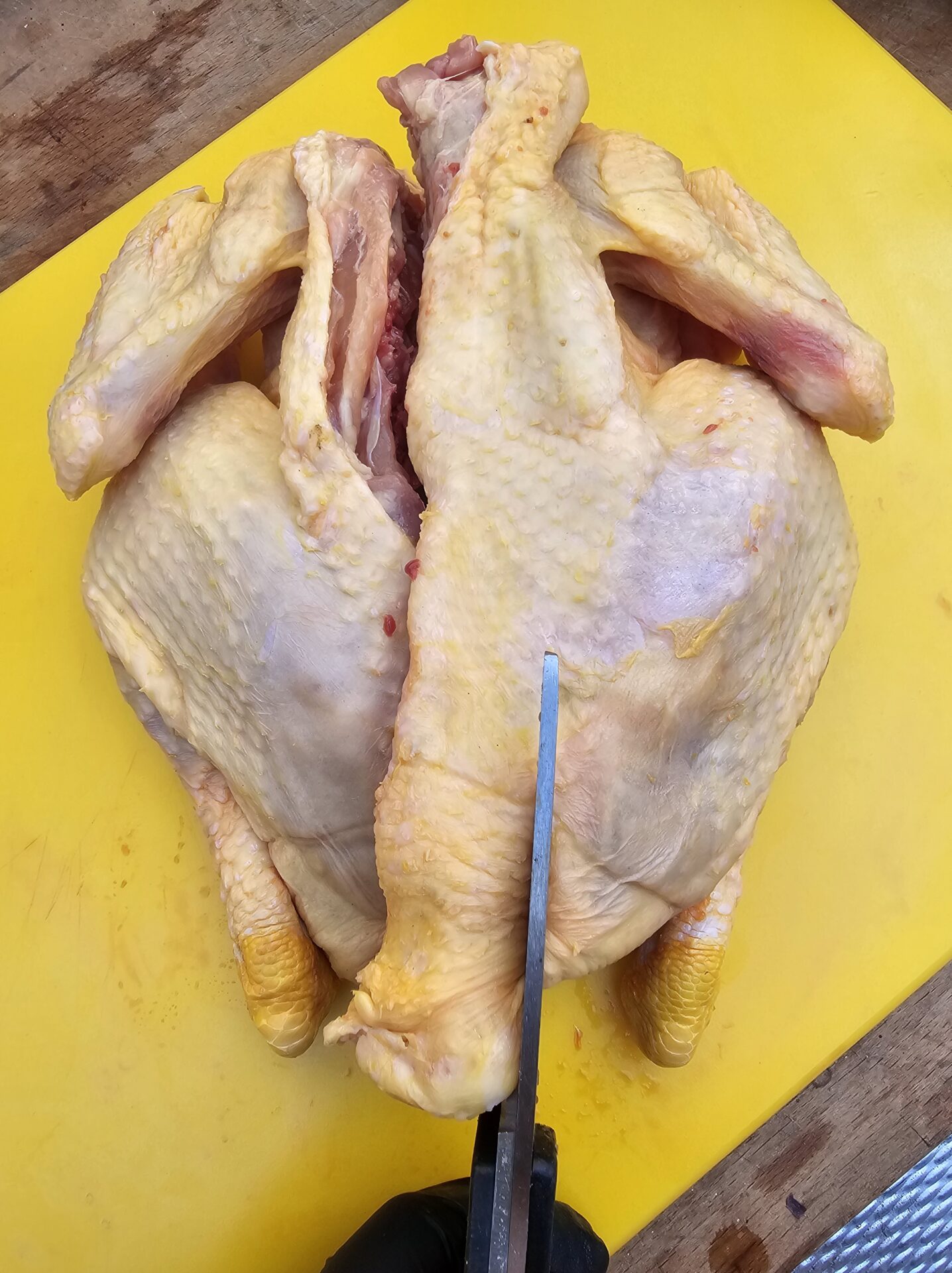 Een hele fijne manier om een hele kip gelijkmatig te garen is door hem te vlinderen. Roadkill chicken of spatchcock chicken wordt het in de barbecue wereld ook wel genoemd. Je vlindert hem door de ruggengraat te verwijderen en drukt hem plat, waardoor hij veel gelijkmatiger zal garen.